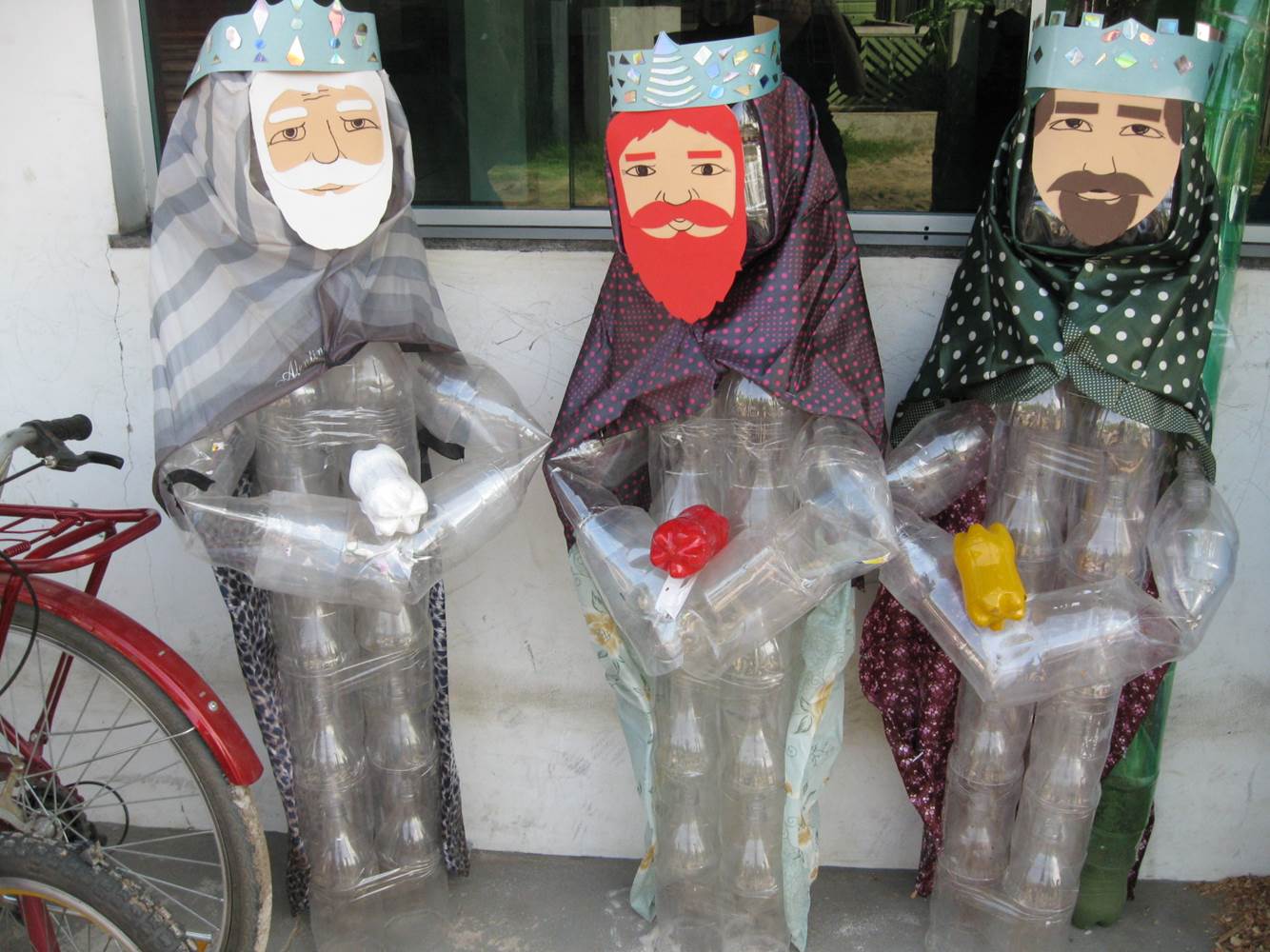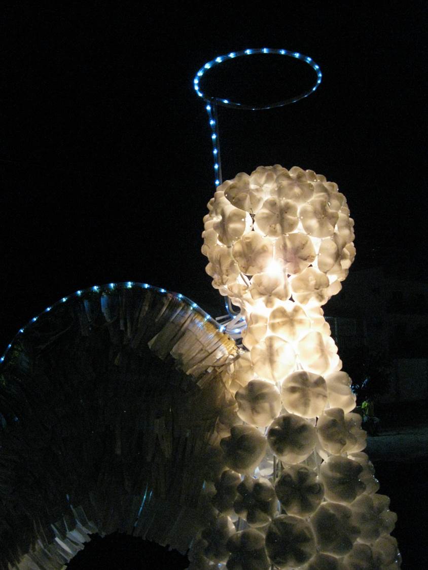 This angel is sporting the soda-bottle bottoms painted white. The wings are strips of plastic from bottle sides.